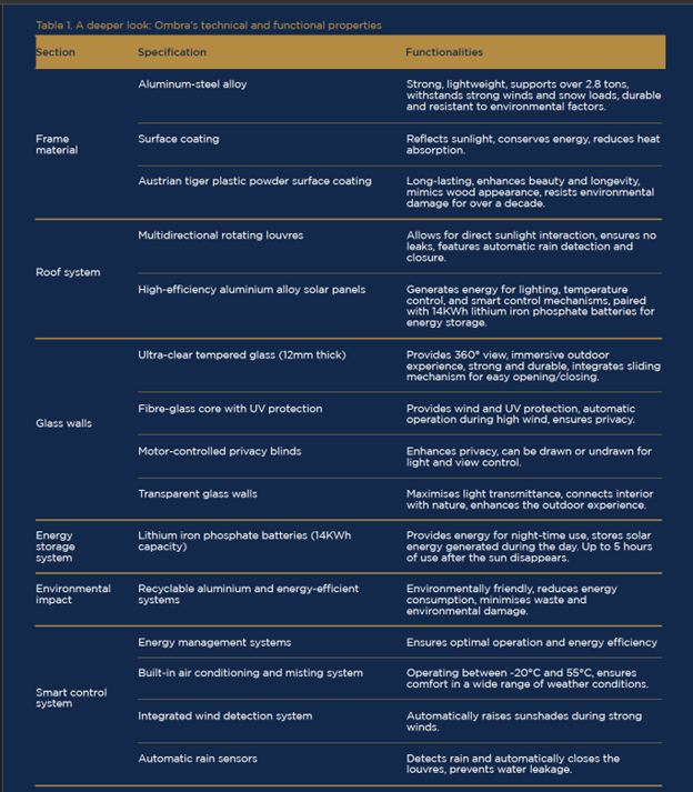 It also has a roof made of rotating louvres which carry solar panels for green energy generation and can open or shut down according to the prevailing weather conditions or user preferences. It also has motor-controlled blinds for additional environmental protection protecting the user from harsh environmental conditions such as UV radiation and other unfavourable weather conditions. The blinds can also be fully closed for enhanced privacy if need be. Finally, the Ombra feature a state-of-the-art sensing system which automatically detects weather conditions and deploys any of its automated mechanisms as needed, such as shutting the louvres or the glass walls, deploying a humidifier or switching on the air conditioning system. These features make Ombra an environmental- and user-friendly product. The key features of Ombra are summarized in Table 1 and shown in Figures 9-11